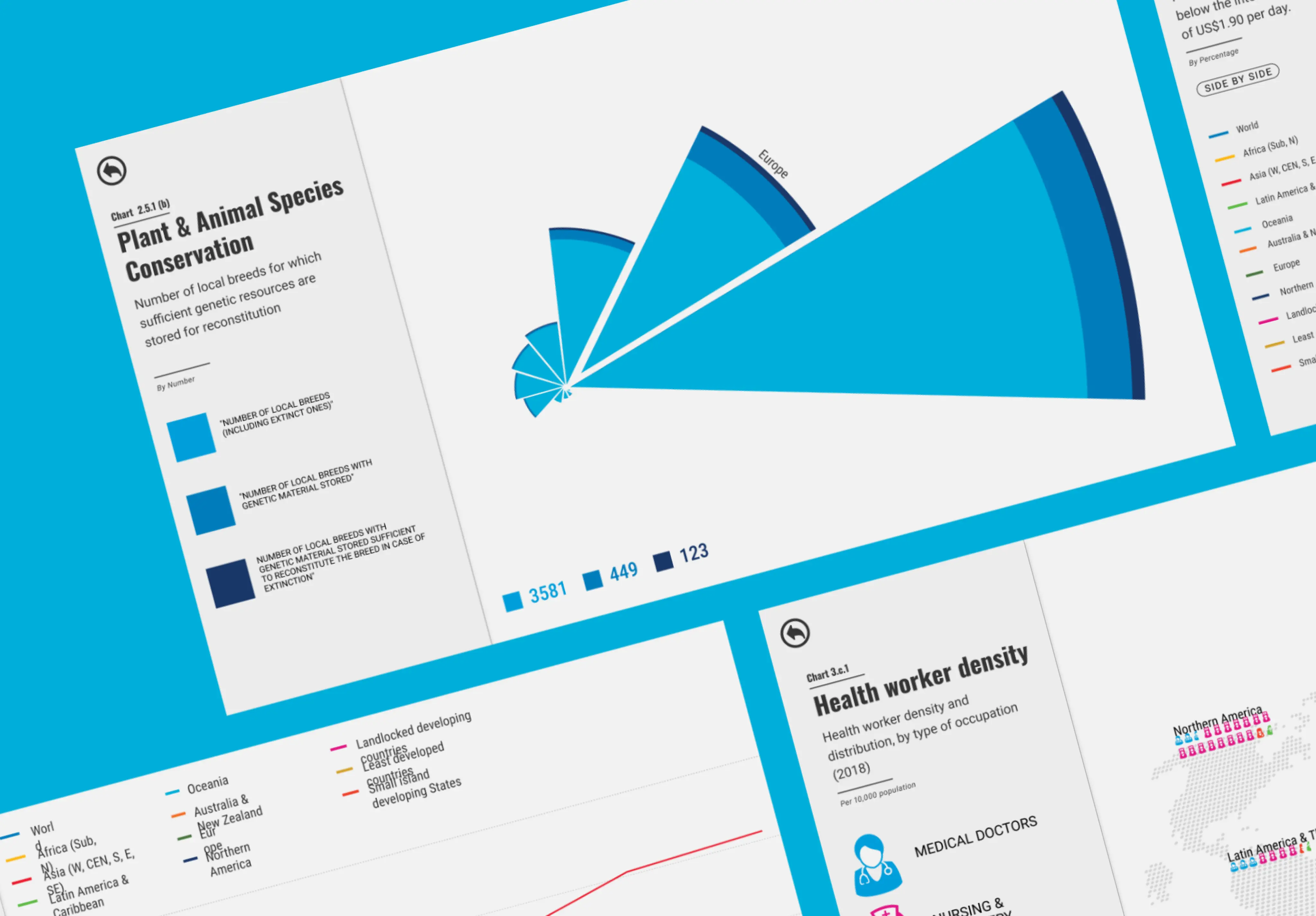 Organize and visualize five selected data sets from the secretary general SDG report of 2021 provided by the UN. Display the data in a visual medium that would help viewers more deeply understand the information.